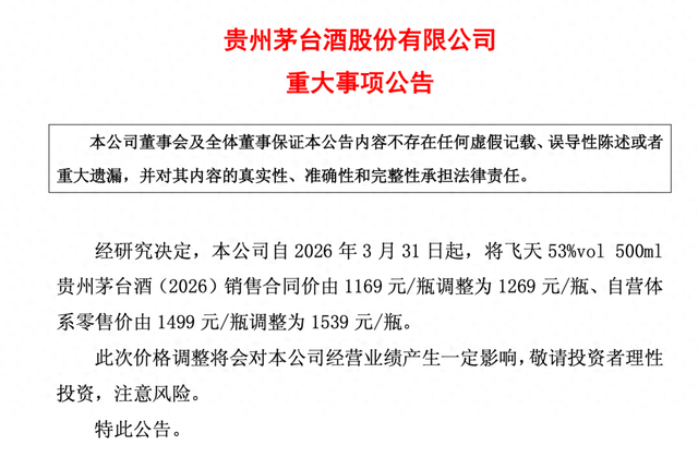 3月30日晚,贵州茅台发布公告,宣布自2026年3月31日起,将飞天53%vol 500ml贵州茅台酒(2026)销售合同价由1169元/瓶调整为1269元/瓶,自营体系零售价由1499元/瓶调整为1539元/瓶。
