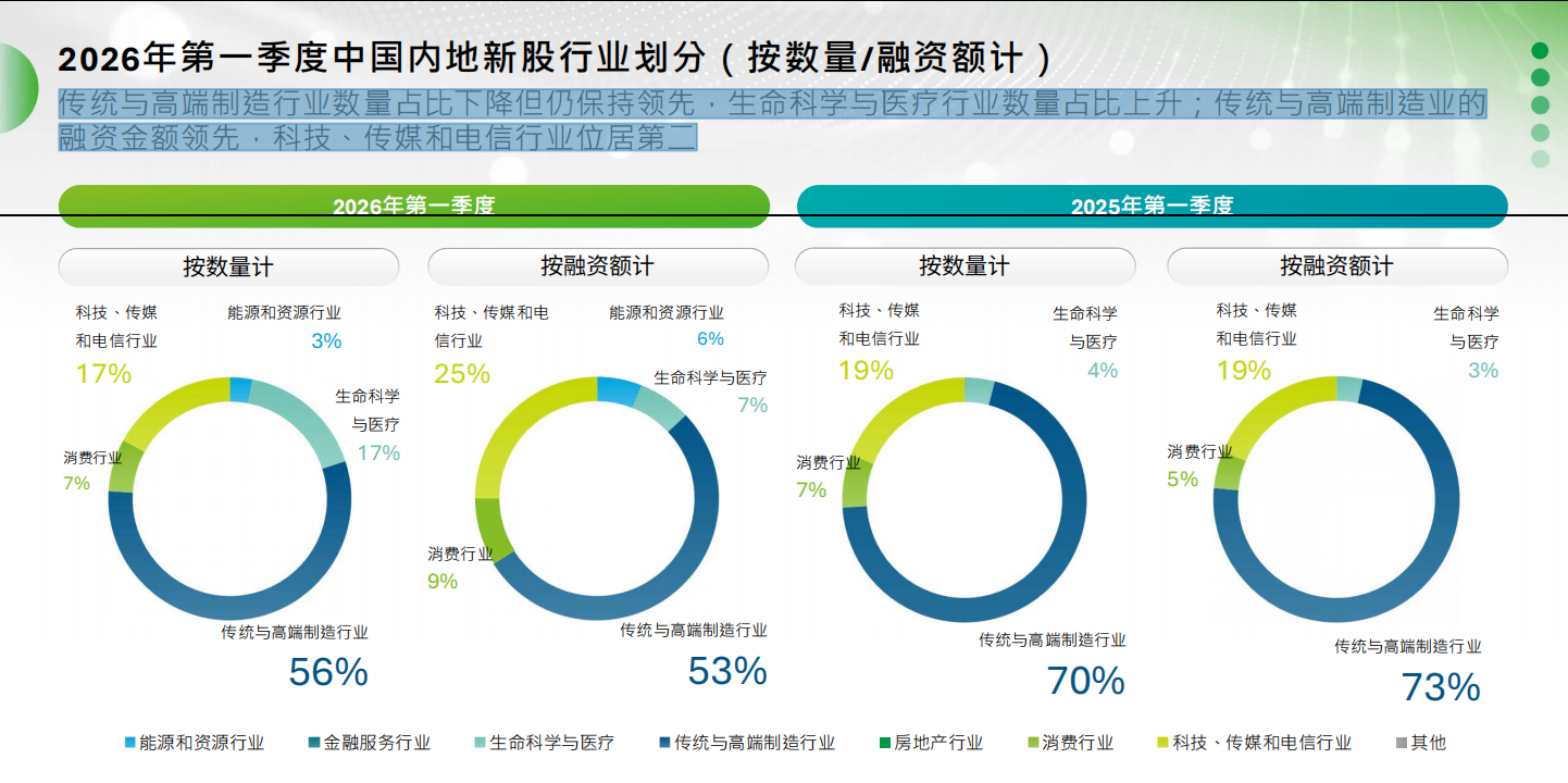 南方+记者注意到,一季度A股新股中,传统与高端制造行业数量占比下降但仍保持领先,生命科学与医疗行业数量占比上升;传统与高端制造业的融资金额领先,科技、传媒和电信行业位居第二。