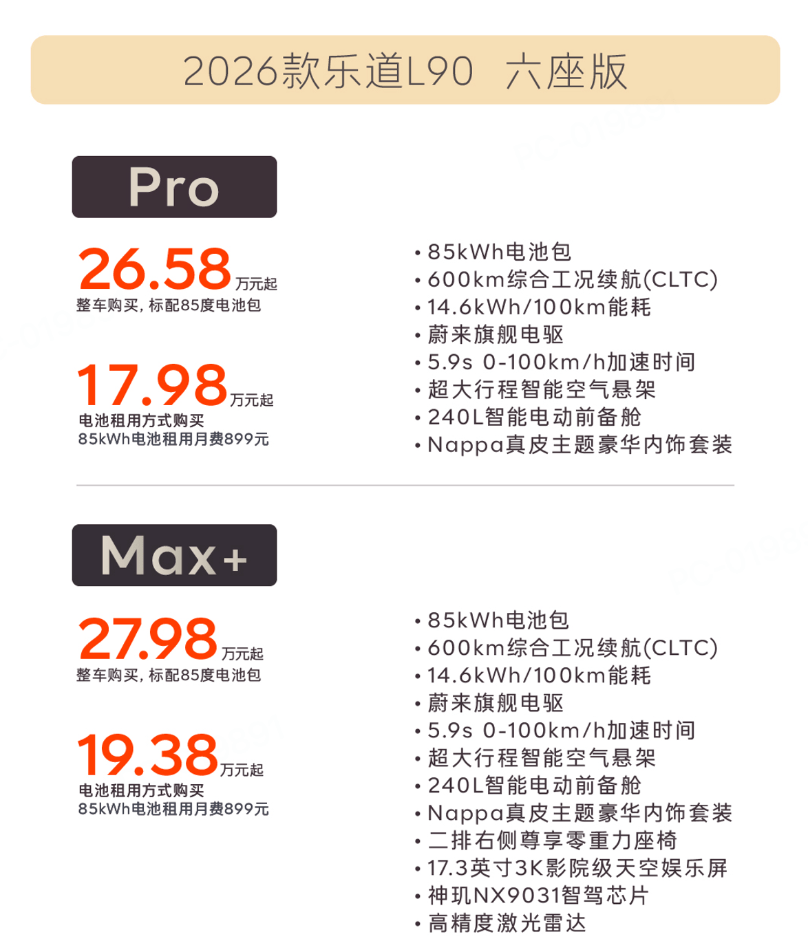网易汽车4月21日报道 作为大三排纯电SUV的新世代之作,L90的此次改款聚焦智能驾驶与外观质感双重升级,整车购买26.58万元起,电池租用方式购买,17.98万元起。八大板块、超过70项软硬件升级。新车全系标配空悬、主题豪华内饰套装等配置,可选Orin X纯视觉和神玑加激光雷达融合感知两种智驾方案,在全面提升智能和舒适性配置的情况下,价格不变。